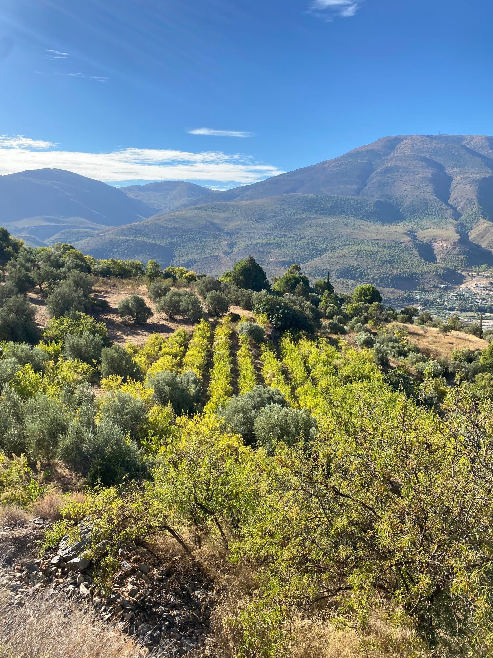 Nuestros campos se encuentran en la ladera sur de la Sierra Nevada, la cadena montañosa que en verano nos provee de agua de deshielo para regar nuestras tierras. Nuestras fincas tienen forma de terrazas, lo que nos permite cultivar en las a veces empinadas laderas de las montañas. Nuestra producción está repartida en varias fincas pequeñas que no están conectadas entre sí.